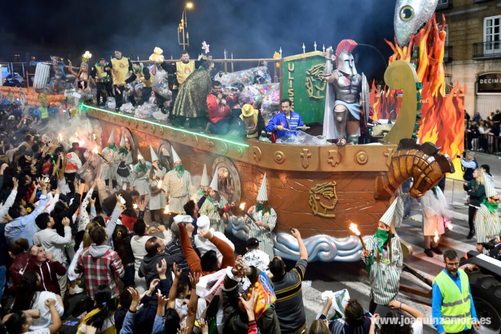 La carroza está capitaneada por una escultura de Ulises, junto al mascarón de proa con silueta de caballo, en referencia al caballo de Troya, dos sirenas en la parte trasera y ocho escudos con imágenes de La Ilíada flanquean la carroza. La carroza tiene 16 metros de largo, 3 de ancho y 5 de alto.